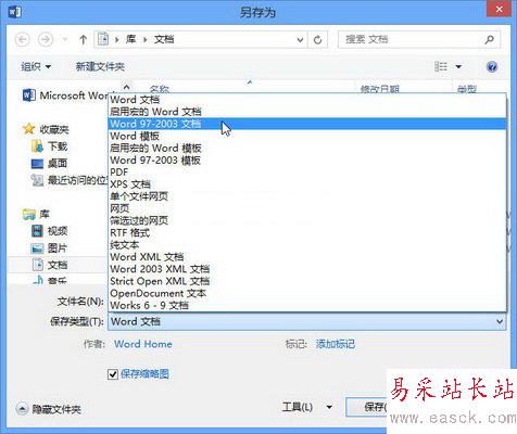 第2步,在打開的“另存為”對話框中,單擊“保存類型”下拉三角按鈕,在文件類型列表中選擇“Word97-2003文檔”選項。然后選擇保存位置并輸入文件名,最后單擊“保存”按鈕即可,如圖2013080407所示。