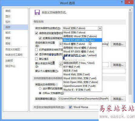 第2步,在打開(kāi)的“Word選項(xiàng)”對(duì)話框中切換到“保存”選項(xiàng)卡,在“保存文檔”區(qū)域單擊“將文件保存為此格式”下拉三角按鈕,并在打開(kāi)的下拉菜單中選擇“Word97-2003文檔(*.doc)”選項(xiàng),并單擊“確定”按鈕,如圖2013080409所示。