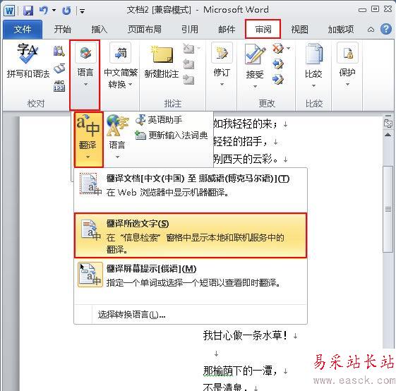 2、在功能區(qū)點(diǎn)擊“審閱”選項(xiàng)卡,選擇“語(yǔ)言”區(qū)域的“翻譯”選項(xiàng)組,單擊“翻譯所選文字”;