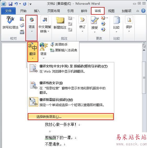 3、單擊“審閱”功能卡,點(diǎn)擊“語(yǔ)言”區(qū)域的“翻譯”選項(xiàng)組,在彈出的下拉菜單中選擇“選擇轉(zhuǎn)換語(yǔ)言”;