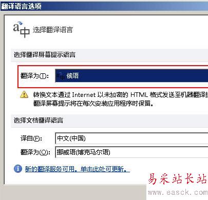 4、此時(shí)窗口會(huì)彈出一個(gè)“翻譯語(yǔ)言選項(xiàng)”的對(duì)話框,在“翻譯為”后面的倒三角的下拉按鈕下選擇自己需要翻譯的語(yǔ)言,例如“俄語(yǔ)”,然后點(diǎn)擊確定;