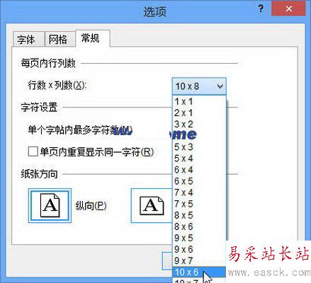 Word2013書(shū)法字帖中的漢字不能通過(guò)設(shè)置字號(hào)來(lái)改變字體大小,不過(guò)可以通過(guò)設(shè)置每頁(yè)字帖的行列數(shù)來(lái)調(diào)整字體的大小。在“選項(xiàng)”對(duì)話(huà)框的“常規(guī)”選項(xiàng)卡中,改變“每頁(yè)內(nèi)行列數(shù)”的規(guī)格即可,如圖2013080420所示。