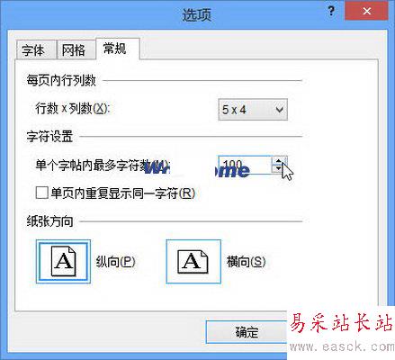 第2步,打開(kāi)“選項(xiàng)”對(duì)話(huà)框,切換到“常規(guī)”選項(xiàng)卡。在“字符設(shè)置”區(qū)域調(diào)整“單個(gè)字帖內(nèi)最多字符數(shù)”的數(shù)值,并單擊“確定”按鈕,如圖2013080419所示。