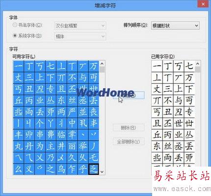 第2步,打開(kāi)“增減字符”對(duì)話(huà)框,在“字體”區(qū)域選中“書(shū)法字體”或“系統(tǒng)字體”選項(xiàng),并在字體列表中選中需要的字體。在“排序順序”列表中選擇“根據(jù)發(fā)音”或“根據(jù)形狀”對(duì)字符進(jìn)行排序,然后在“字符”區(qū)域的“可用字符”列表中拖動(dòng)鼠標(biāo)選中需要作為字帖的漢字。單擊“添加”按鈕將選中的漢字添加的“已用字符”區(qū)域,并單擊“關(guān)閉”按鈕,如圖2013080416所示。