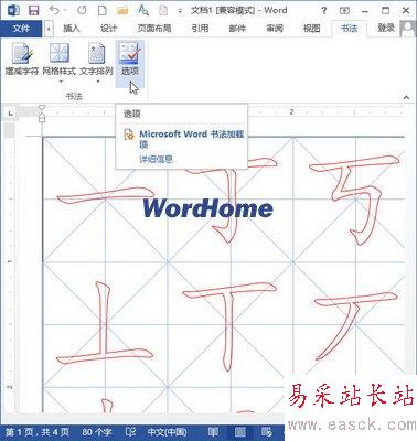 第1步,在書(shū)法字帖編輯狀態(tài)下,單擊“書(shū)法”功能區(qū)的“選項(xiàng)”按鈕,如圖2013080418所示。