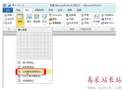 3、點(diǎn)擊“插入 -> 表格 -> 文本轉(zhuǎn)換成表格”,然后設(shè)置列數(shù)、行數(shù)和文字分隔位置,點(diǎn)擊“確定”按鈕。