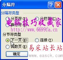 2、彈出“分隔符”對話框,選擇“分節(jié)符”類型中的“下一頁”,單擊“確定”按鈕。如圖: