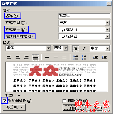 上圖中,有四個(gè)地方是需要你設(shè)置的,分別是名稱、樣式基于(這里就選擇標(biāo)題4)、后續(xù)段落樣式和添加到模板。