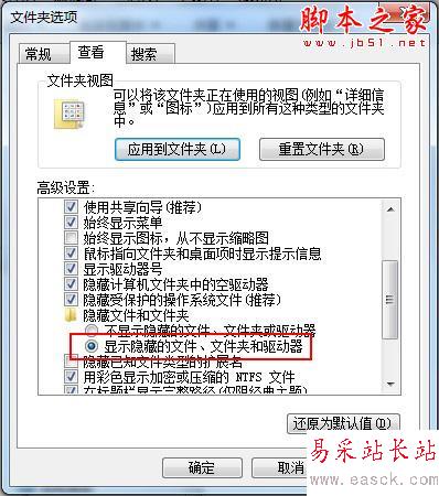 步驟二、打開(kāi)了“文件夾選項(xiàng)”窗口,切換到“查看”窗口,然后“隱藏文件和文件”選項(xiàng)上點(diǎn)選“顯示隱藏的文件、文件夾和驅(qū)動(dòng)器”選項(xiàng),如圖所示: