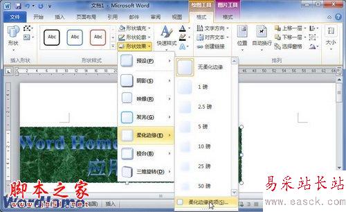 第3步,打開形狀效果菜單,指向“柔化邊緣”選項。在打開的柔化邊緣效果列表中任意一種柔化邊緣效果,則Word2010文檔中的藝術字將實時顯示最終效果。確定使用某一種柔化邊緣效果后單擊該效果即可。