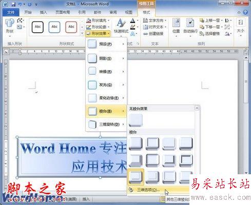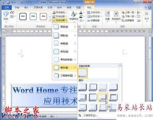 第3步,打開形狀效果菜單,指向“棱臺”選項。在棱臺列表中,將鼠標指向任意一種棱臺效果,則Word2010文檔中的藝術字將實時顯示最終效果。確認使用該棱臺效果后單擊該效果即可。