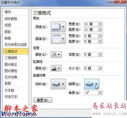 打開“設置形狀格式”對話框,在“三維格式”選項卡中,用戶可以對棱臺頂端和底端的高度和寬度進行設置,也可以設置棱臺深度和輪廓線的顏色。另外對棱臺的表面效果進行材料和照明方面的設置,能夠明顯改變藝術字的棱臺效果。完成設置后單擊“關閉”按鈕即可。