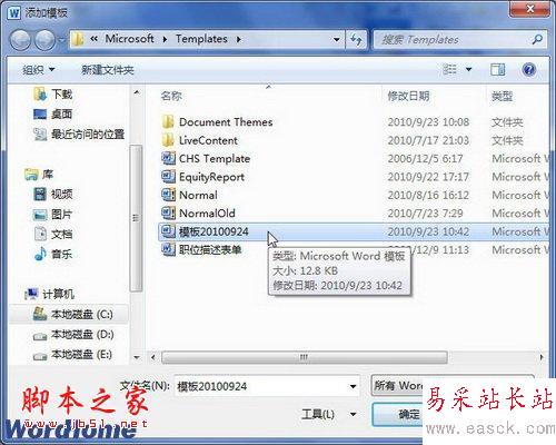 第3步,打開“添加模板”對話框,找到并選中準備設置為共用模板的Word2010模板,并單擊“確定”按鈕,如圖3所示。