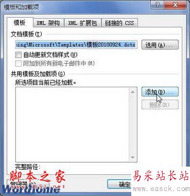 第2步,在打開的“模板和加載項”對話框中切換到“模板”選項卡,然后在“共用模板及加載項”區域單擊“添加”按鈕,如圖2所示。