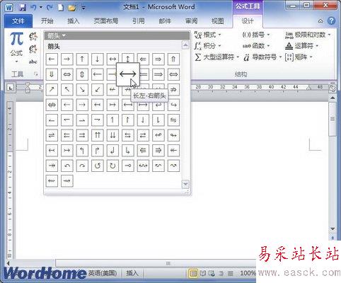 第2步,在“公式工具/設計”功能區的“符號”分組中單擊“其他”按鈕打開符號面板,然后單擊頂部的下拉三角按鈕。在打開的下拉菜單中選擇“箭頭”選項,并在打開的箭頭符號面板中選擇所需的箭頭符號即可,如圖2所示。