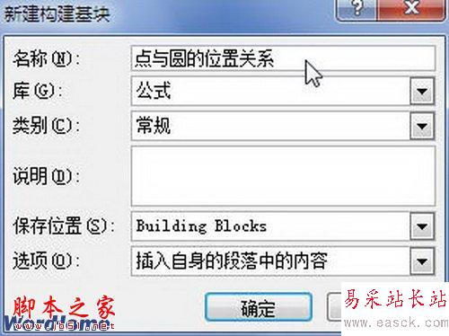 第2步,打開“新建構建基塊”對話框,在“名稱”編輯框中輸入公式名稱,其他選項保持默認設置,并單擊“確定”按鈕,如圖2011072808所示。