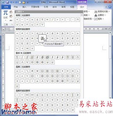第2步,在“公式工具/設計”功能區的“符號”分組中單擊“其他”按鈕打開符號面板,然后單擊頂部的下拉三角按鈕。在打開的下拉菜單中選擇“運算符”選項,并在打開的運算符面板中選擇所需的運算符即可,如圖2所示。