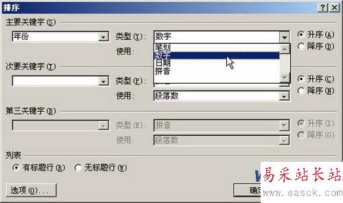 第3步,在Word 2007“主要關鍵字”區域,單擊關鍵字下拉三角按鈕選擇排序依據的主要關鍵字。單擊“類型”下拉三角按鈕,在Word 2007“類型”列表中選擇“筆畫”、“數字”、“日期”或“拼音”選項。如果參與排序的數據是文字,則可以選擇“筆畫”或“拼音”選項;如果參與排序的數據是日期類型,則可以選擇“日期”選項;如果參與排序的只是數字,則可以選擇“數字”選項。選中“升序”或“降序”單選框設置排序的順序類型,如圖所示。