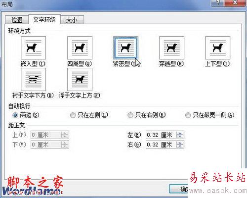 第4步,打開“布局”對話框,切換到“文字環繞”選項卡。在“環繞方式”列表中選擇除“嵌入型”以外的任意文字環繞方式(例如選擇“緊密型”),并單擊“確定”按鈕,如圖2011072804所示。