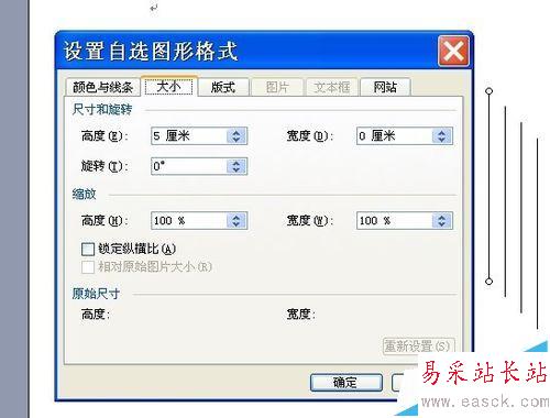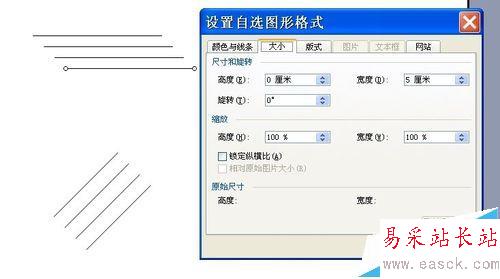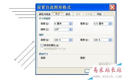 2、我們準備畫一個5厘米的正方體,所有把橫線和豎線利用“設置自選畫形格式”中的“大小”把高或寬調整為5厘米;還有四條斜線,也是利用“設置自選畫形格式”中的“大小”把它的寬度(我用的是橫線)調整小一點,再在下面的旋轉把旋轉“135度”。