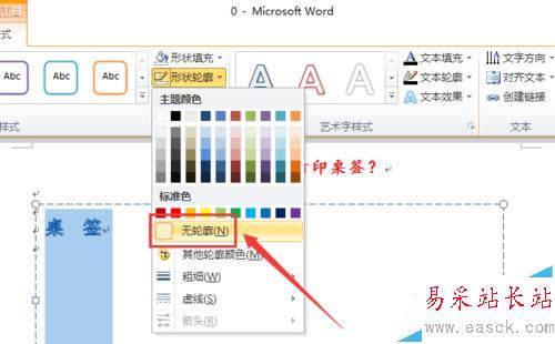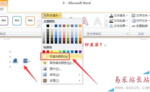 4、接著,在空白區域繪制一個較大的文本框,并輸入“桌簽”字樣,調整文本框的填充屬性為“無填充”,如圖所示。