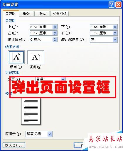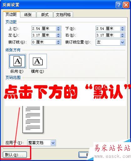 2、點擊“頁面設置”框左下角的“默認”,如下圖所示: