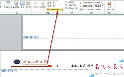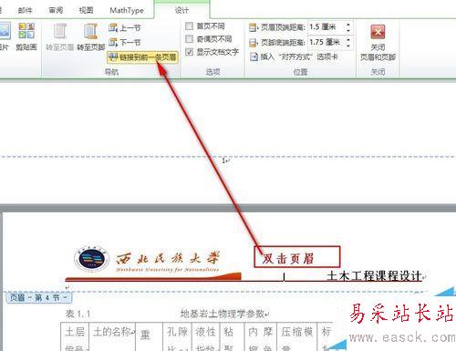 3、雙擊插入的橫向頁面的頁眉,在設計中點擊取消鏈接到前一條頁眉,同樣的方法取消其后一頁的鏈接到前一條頁眉。(這樣是在編輯橫向頁面頁眉的時候不會影響到其它地方的頁眉)
