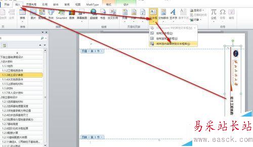 1、雙擊頁眉,選中剛剛插入的文本框,在插入->文本框中點擊將所選內容保存到文本框庫。
