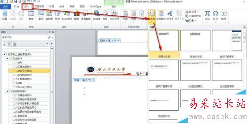 4、雙擊橫向頁面的頁眉,在插入->文本框->內置中找到第一個簡單文本框,點擊插入。如圖