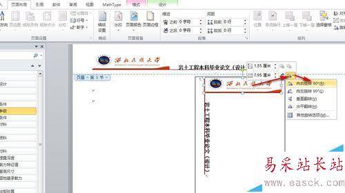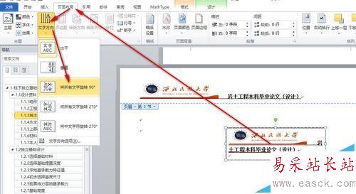 6、選中文本框,在頁面布局中找到文字方向,點擊將所有文字向右旋轉90度,如果頁眉中有圖片 則選中圖片使其向右旋轉90度,如圖