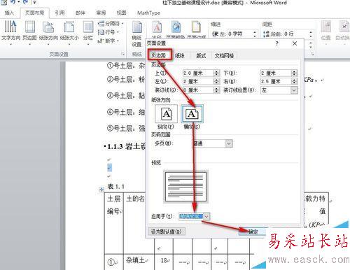 2、在頁邊距中選擇紙張方向為橫向,應用于所選文字,確定!