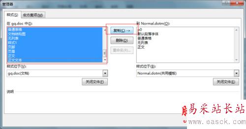 4、選擇新的樣式模板后,選中左側框中所有的樣式,然后點擊中間的復制按鈕。