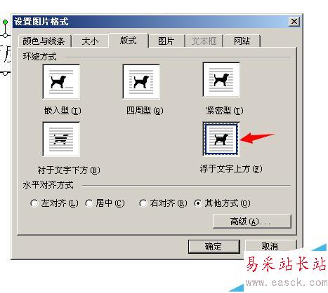 4、在版式對話框中將其版式設置為“稱于文字上方”(當然如果需要也可選擇“稱于文字下方”)