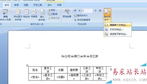 7、選擇“郵件”-“完成”-“完成并合并”-“編輯單個文檔”命令,在彈出的“合并到新文檔”對話框中,點選“全部”選項,然后單擊“確定”按鈕即可。