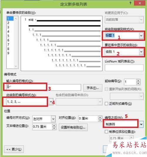 按照下圖中所示的順序設置編號格式,可以在標號1處,選擇不同的標題,對應于左側(cè)不同的級別,將所有的級別都進行類似的修改,以方便以后的使用: