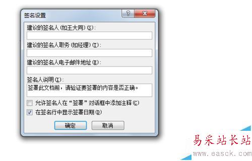 5、輸入相關內容,點擊“確定”按鈕,此時會在word文檔中多了一個簽名框