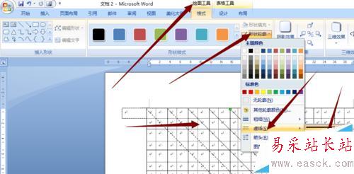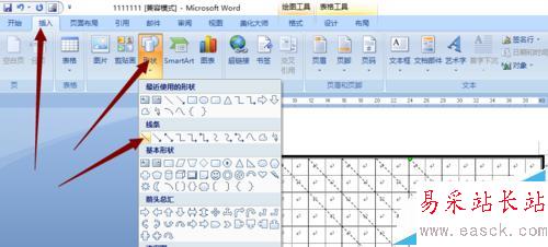 8、在田字格的基礎上制作米字格,在從上方的工具欄插入——形狀——線條——直線,沿著田字格對角線開始畫線。