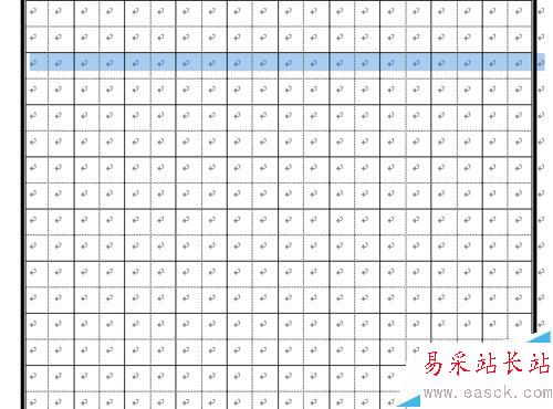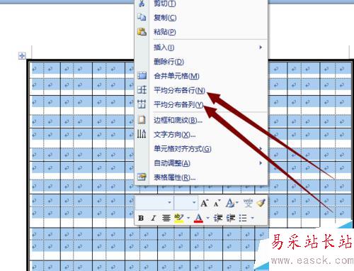 7、畫完行與列的虛線后,先保存,在選中全部表格右鍵,先后選擇平均分布各行與 平均分布各列,這時田字格制作完成。