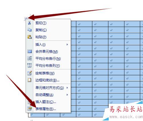 3、輸入后確定,在表格左上角小符號右鍵,選擇表格屬性。