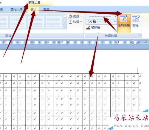 6、在制作表格時上面會出現“表格工具”欄選擇“設計——繪制表格——在選擇線的形式(虛線、實線、粗細等)。在每行和每列中進行劃線。