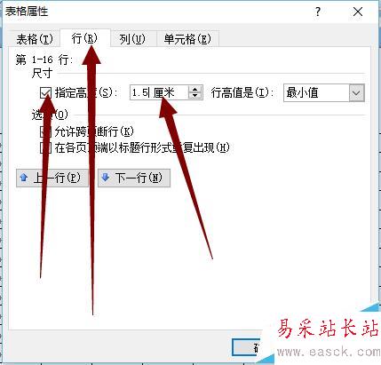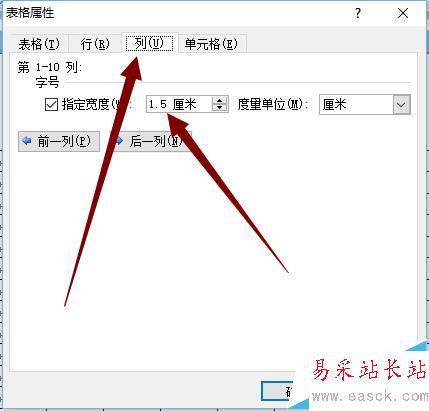 4、在表格屬性對話框中設置行、列,在指定高度與寬度對話框前打勾,方格、田字格、米字格都是正方形的,在這里保證高度與寬度設置相同即可,根據自己的 需求設置格子的大小。