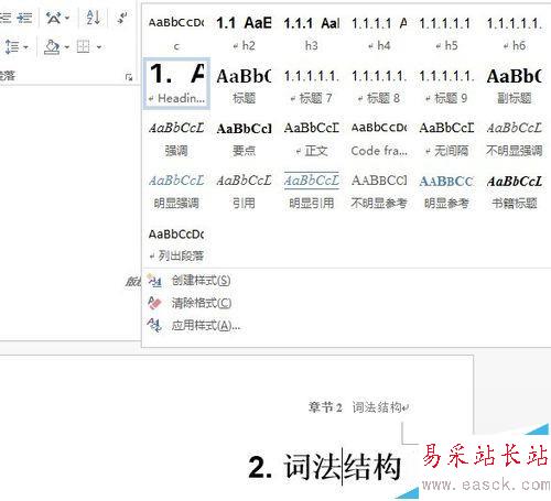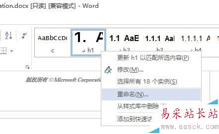 3、找到任意的章節(jié)標(biāo)題,在標(biāo)題文字行內(nèi)單擊,將光標(biāo)移動到標(biāo)題行內(nèi)。此時可以看到,在樣式欄,標(biāo)題行的樣式被自動選定。這時右鍵樣式,選擇「重命名」或「修改」