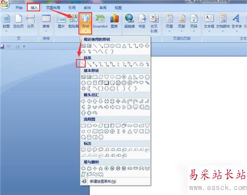 2、在word里面也有,我們打開軟件,新建一個文檔,點擊插入功能以后,再用鼠標在插功能欄下面形狀工具。點擊形狀工具會出現下拉菜單,在下拉菜單上面的線條工具里面點擊直線工具;