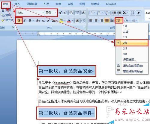 6、選中文字的標題部分(可以按Ctrl鍵同時單擊或者拖拽,選取不同位置的文字),然后單擊“開始”,設置文字的大小,字體,和黑體等,然后選擇行間距為2.0:
