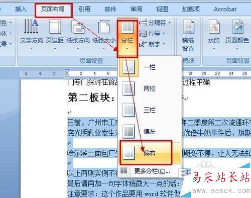 9、將另一部分正文選擇“頁面布局,分欄,偏右”進行分欄: