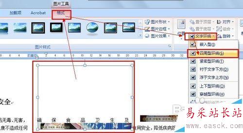 11、選擇其中一個圖片,然后單擊“格式,文字環繞,四周型環繞”。同樣的方法設置另一張圖片: