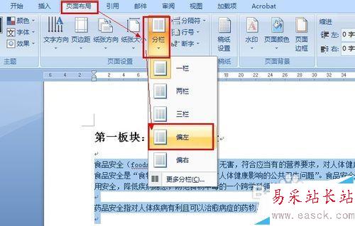 8、選擇要分欄的文字,然后依次單擊“頁面布局,分欄,偏左: