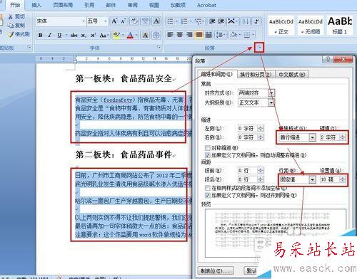 7、選中正文部分,然后單擊段落欄的右下角圖標,設置首行縮進2字符,和固定值為18磅后,單擊“確定”: