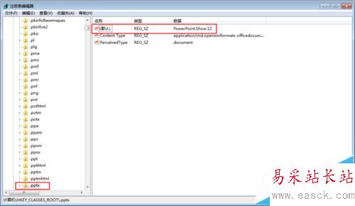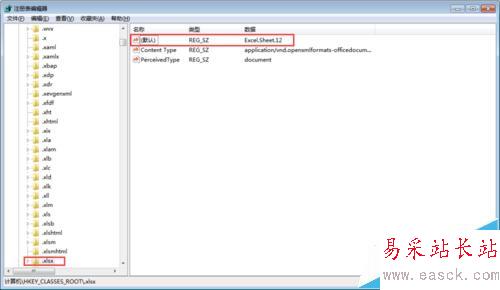 7、按照同樣的方法,我們進(jìn)入注冊表尋找“xlsx”的位置,并將(默認(rèn))改為Excel.Sheet.12;然后尋找“pptx”,將(默認(rèn))改為PowerPoint.Show.12。