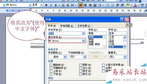 2、點擊格式->字體,彈出對話框。找到“西文字體”將“MT Extra”改為“(使用中文字體)”
